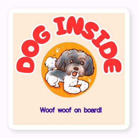上部にDOG INSIDE(わんこが乗ってます) 下部にWoof woof on board!(ワンワン乗っています!)が表示されています。